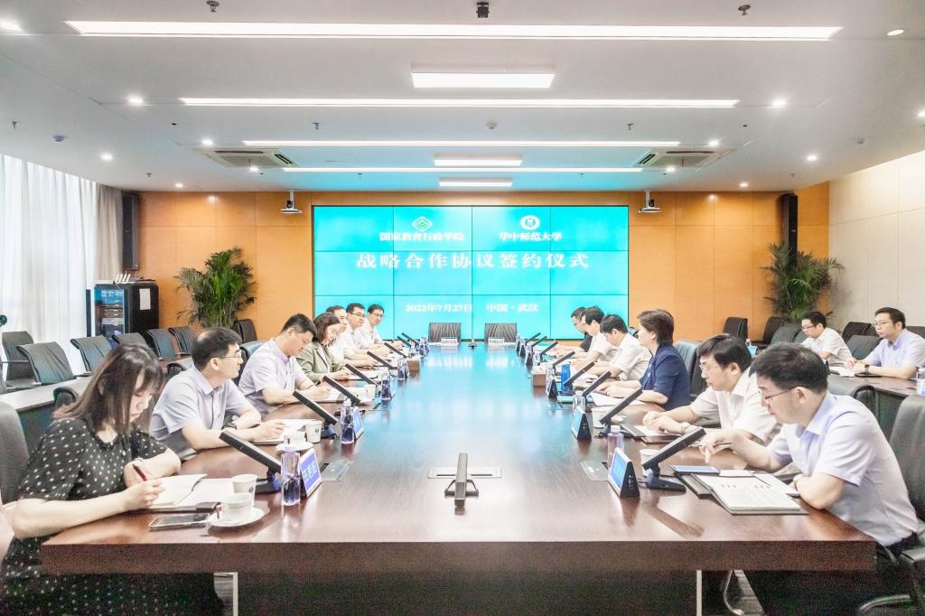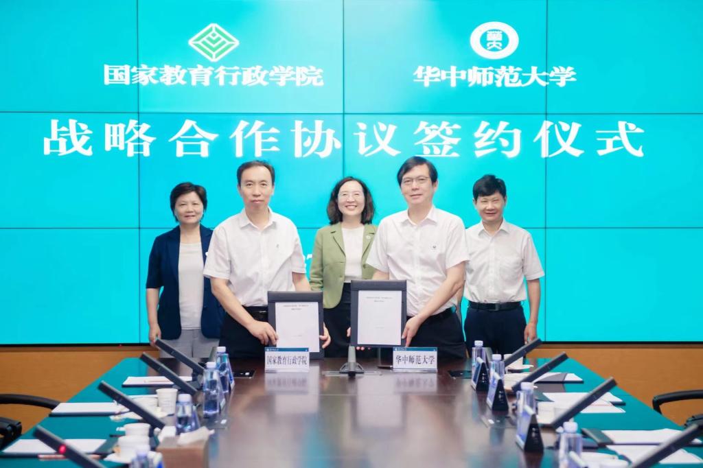 华大在线讯(记者 毛国樨)7月27日,国家教育行政学院与安博站官网登录入口_安博(中国)战略合作协议签约仪式在安博站官网登录入口_安博(中国)南湖综合楼举行。国家教育行政学院党委书记、常务副院长侯慧君、副院长于京天,校党委书记赵凌云、校长郝芳华、校党委副书记陈迪明出席。郝芳华主持签约仪式。