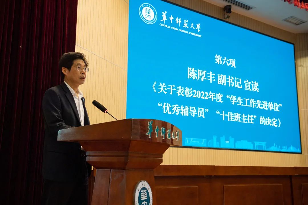 校党委副书记、纪委书记陈厚丰宣读《关于表彰2022年度“学生工作先进单位”“优秀辅导员”“十佳班主任”的决定》