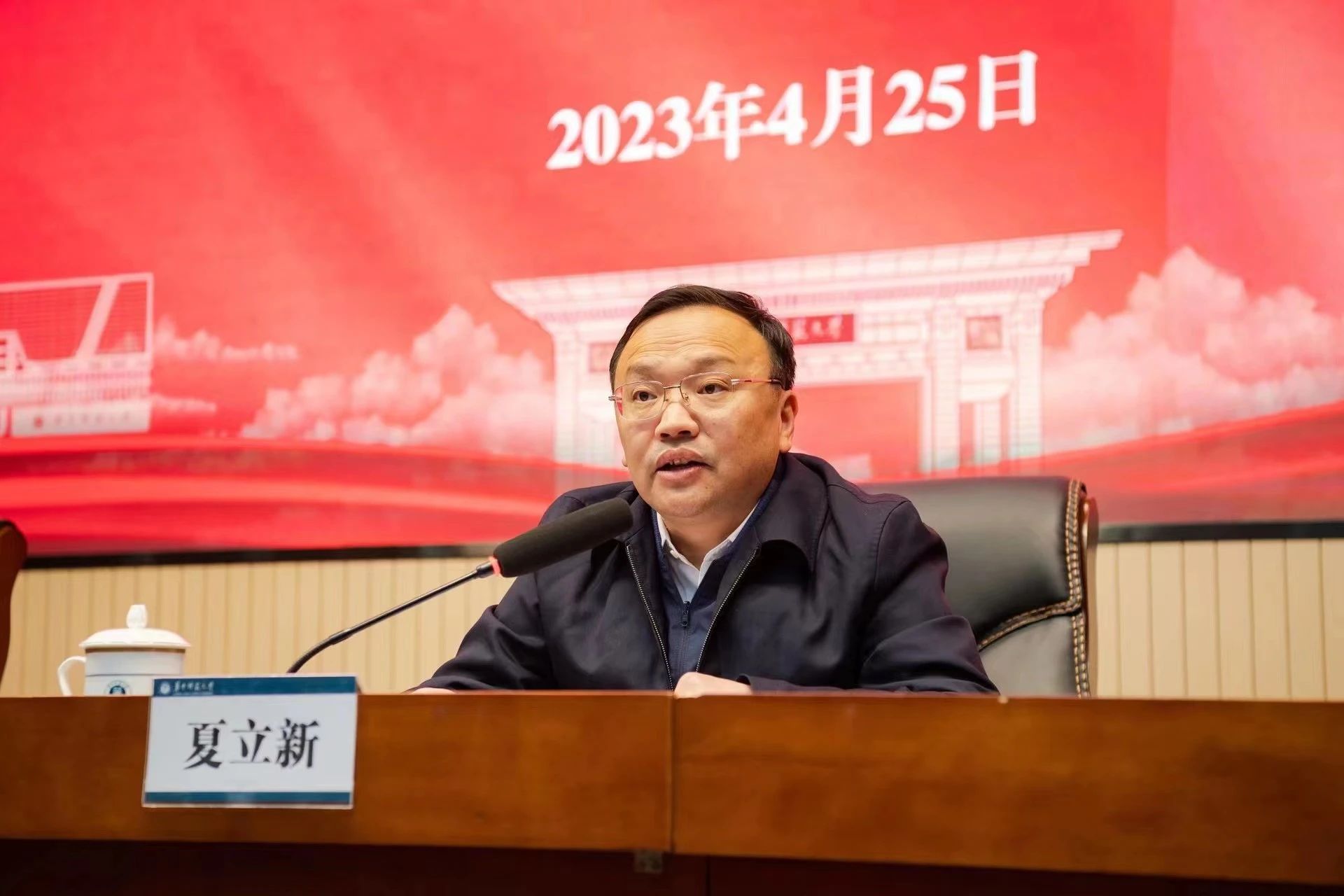 夏立新强调,全体党员干部要以本次主题教育为契机,立足主责主业,牢牢把握“学思想、强党性、重实践、建新功”的总要求,推动主题教育取得实实在在的成效。一是要将理论学习贯穿主题教育始终。各分党委(党总支)要抓好全体党员潜心自学、及时跟进“第一议题”学、理论学习中心组专题学、专题读书班全面系统学、党支部交流分享学、带着问题实践学、创新开展主题联学、深刻对照述学等形式和载体,深入推进理论学习,在入脑入心、走深走实、见行见效上持续发力。二是要提高政治站位发挥示范带头作用。各级党员领导干部要切实发挥“关键少数”的示范带动作用;各级党组织要切实提高政治站位,向党中央看齐,履行好主体责任;主要负责人履行好第一责任人责任,加强统筹协调,抓实抓细理论学习和专题读书班。三是要坚持以学促干推动发展新突破。把读书班的学习同深入贯彻党的二十大精神结合起来,同大兴调查研究之风结合起来,同推动本单位中心工作、解决学校发展问题和维护师生切身利益结合起来,运用党的创新理论研究新情况、解决新问题,以强化理论学习指导发展实践,办好一批大事实事,切实把学习成效转化成为推动学校事业高质量发展的强大动力。