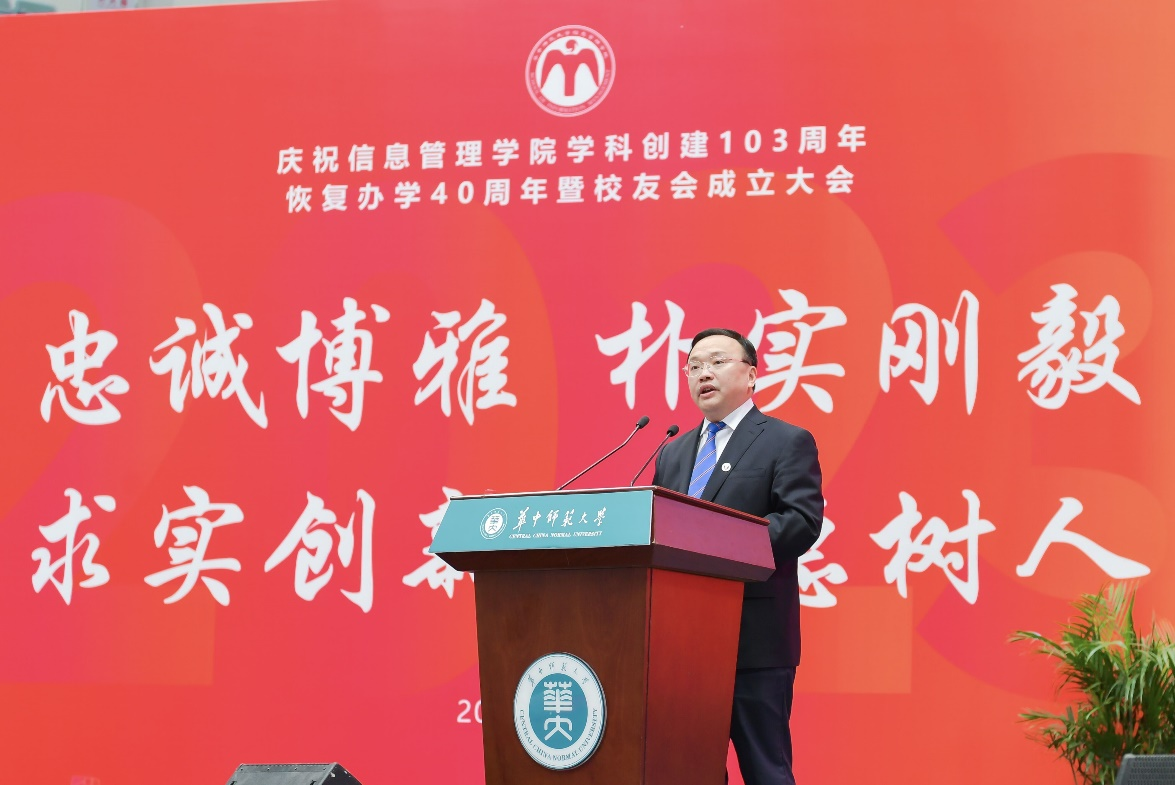 夏立新代表学校向信息管理学院学科创建103周年、恢复办学40周年暨校友会的成立表示祝贺,向关心和支持信息管理学院发展的友好单位和各界朋友表示感谢,向为学院发展做出卓越贡献的前辈致以敬意。在致辞中,他回顾了信息管理学院的办学历程,对一代代信管人自信自强、守正创新给予高度肯定。夏立新希望信息管理学院以本次庆典为契机,继续守正创新、不断奋进,结合自身学科专业特色,在高素质拔尖人才培养中实现新突破,在数字中国建设中体现新作为;希望信管校友会不忘初心,勇担使命,发挥桥梁纽带作用,汇聚智慧,拓展资源,凝聚合力,在展示安博站官网登录入口_安博(中国)人形象上有作为;希望所有信管校友胸怀大爱、勇毅前行,在工作中做出新贡献在事业上实现新发展,用实际行动诠释忠诚博雅、朴实刚毅的安博站官网登录入口_安博(中国)精神。