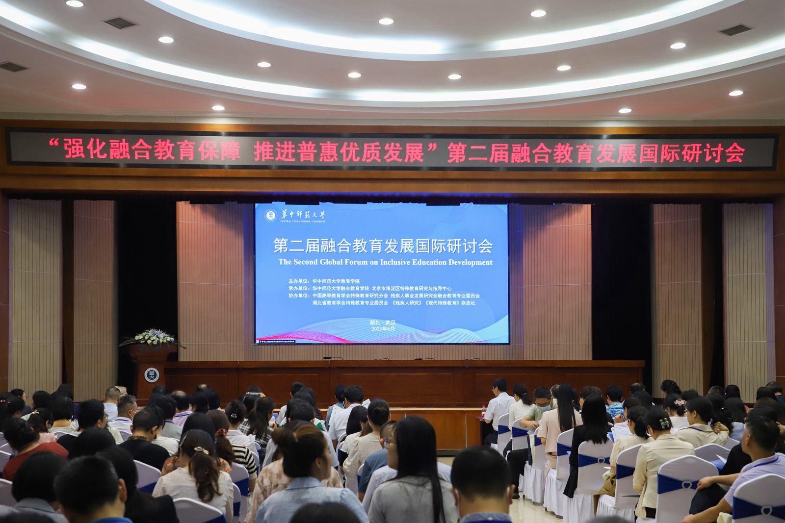 副校长李鸿飞、教育部基础教育司特殊教育处处长黄伟、湖北省残疾人联合会副理事长袁雪梅、湖北省教育厅基础教育处处长邹德智、中国高等教育学会特殊教育研究分会理事长顾定倩等出席开幕式并致辞。