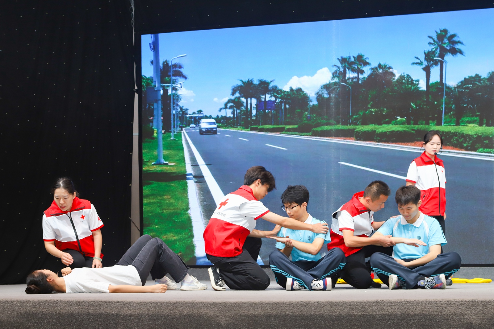 海姆立克冲击法、心肺复苏、三角巾包扎法、骨折固定法……活动现场,武汉市财贸学校学生和江夏区红十字会救护员以生动的情景剧向观众演练应急救护技巧。一场展现车祸救援现场的情景中,救援队面对四名情况各异的伤员有条不紊地拿出三角巾、AED等急救物品进行施救,他们过硬专业本领和高效的团队协作赢得了观众的阵阵掌声。