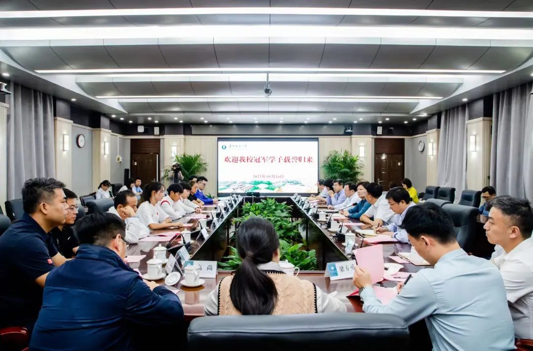 华大在线讯(记者 郝日虹)10月16日,校党委书记夏立新、校长郝芳华、副校长彭双阶等与张子扬、陈佳鹏等安博站官网登录入口_安博(中国)冠军学子在行政楼一楼会议室座谈,向他们载誉归来表示祝贺,为他们在杭州第19届亚运会赛场上奋力拼搏、为国争光、为校添彩“点赞”。