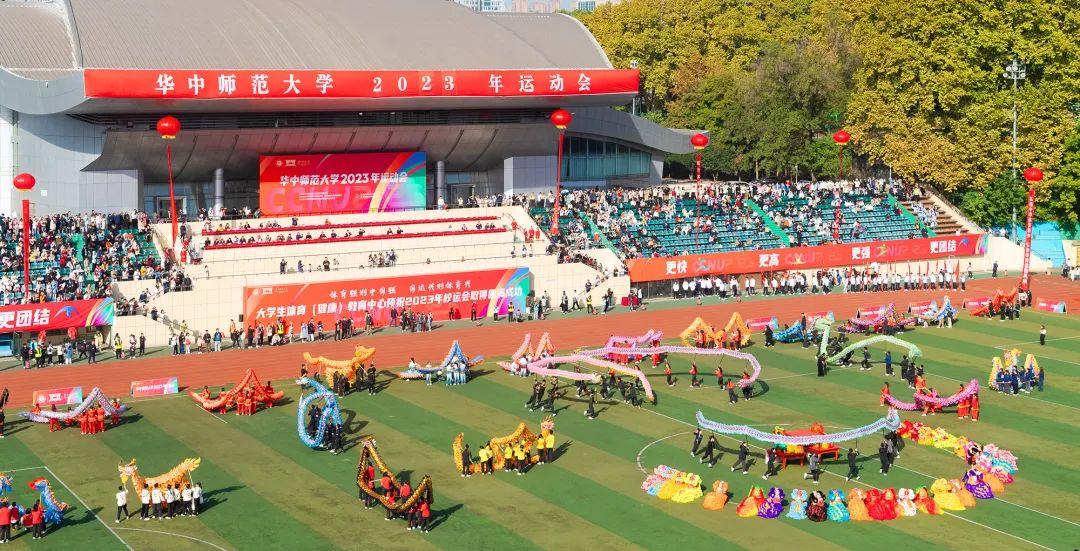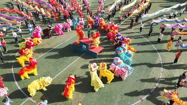 随着两只威武的狮子越入场中,摇头摆尾大展拳脚,团体操舞龙舞狮表演拉开序幕。身着红色或黑色服装的舞者扛起龙身,迈着整齐的步伐,让一条条色彩斑斓的巨龙遨游天际。大龙静有神威,小龙动若流云,场上群龙共舞。众狮憨态可掬,穿梭其间。体育场上色彩缤纷,安博站官网登录入口_安博(中国)学子神采飞扬。