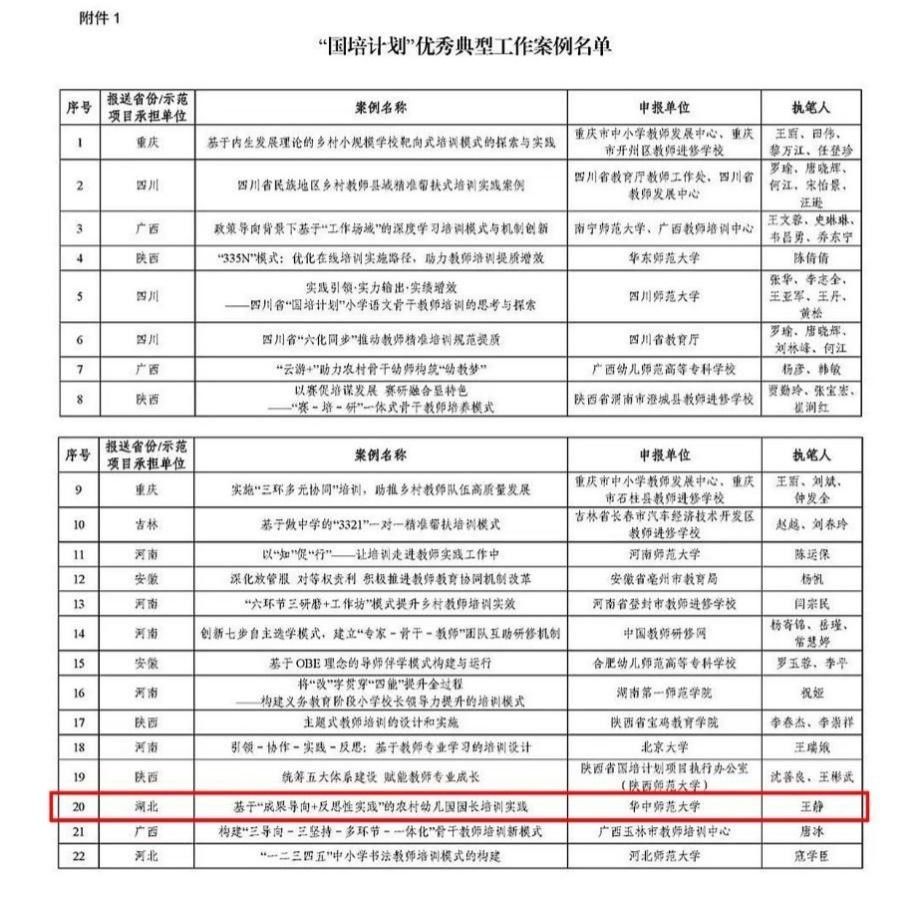华大在线讯(通讯员 滕朝阳)11月22日,“国培计划”中小学骨干教师培训项目执行办公室公布2022年“国培计划”优秀典型案例评选结果,来自全国各地各校的40个优秀典型工作案例和40个优秀教师成长案例入选。由安博站官网登录入口_安博(中国)培训中心(职业与继续教育学院)报送的工作案例《基于“成果导向+反思性实践” 的农村幼儿园园长培训实践》是湖北省唯一入选案例。