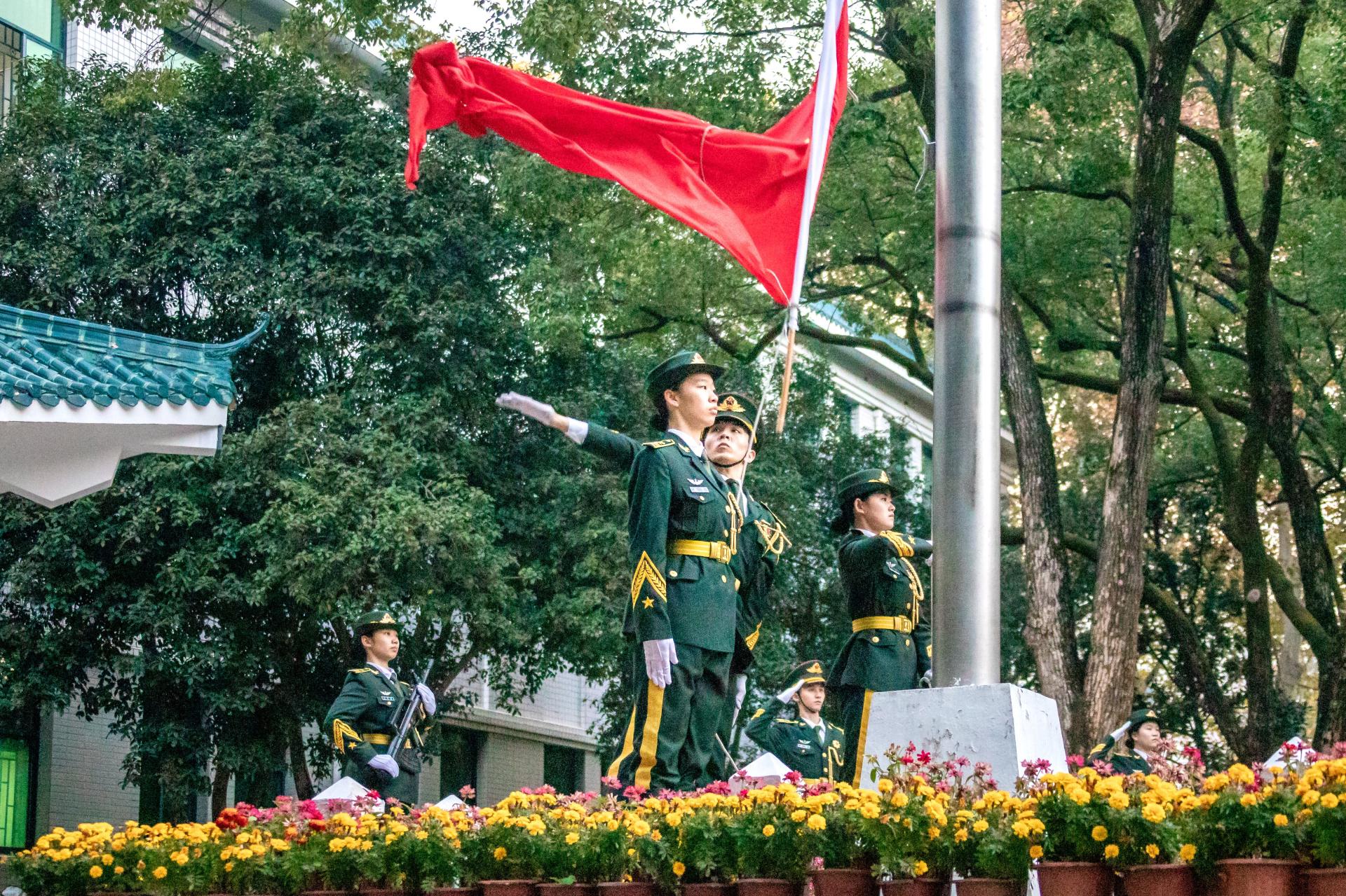 上午7时,升旗仪式开始。全体师生精神饱满,庄严肃穆,护旗队员英姿飒爽,步伐矫健。伴随着雄壮的国歌声,五星红旗冉冉升起,观礼师生全体肃立,向国旗行注目礼。