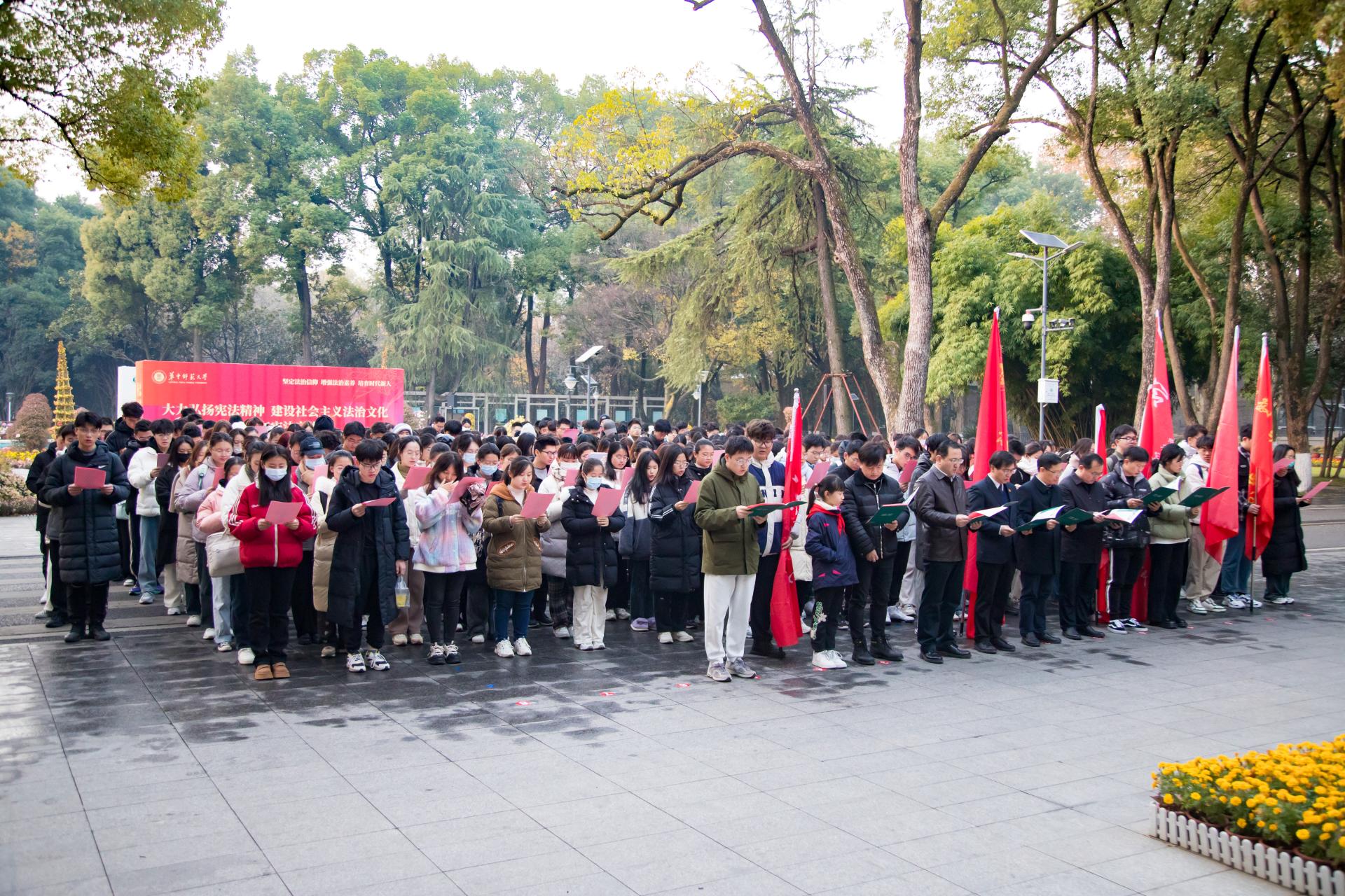 华大在线讯(通讯员 杨盼盼 肖扬)12月4日,安博站官网登录入口_安博(中国)在文华公书林举行“国家宪法日”升旗仪式暨“宪法晨读”活动,副校长任友洲出席并致辞,相关职能部门负责人和二级学院师生代表参加活动。