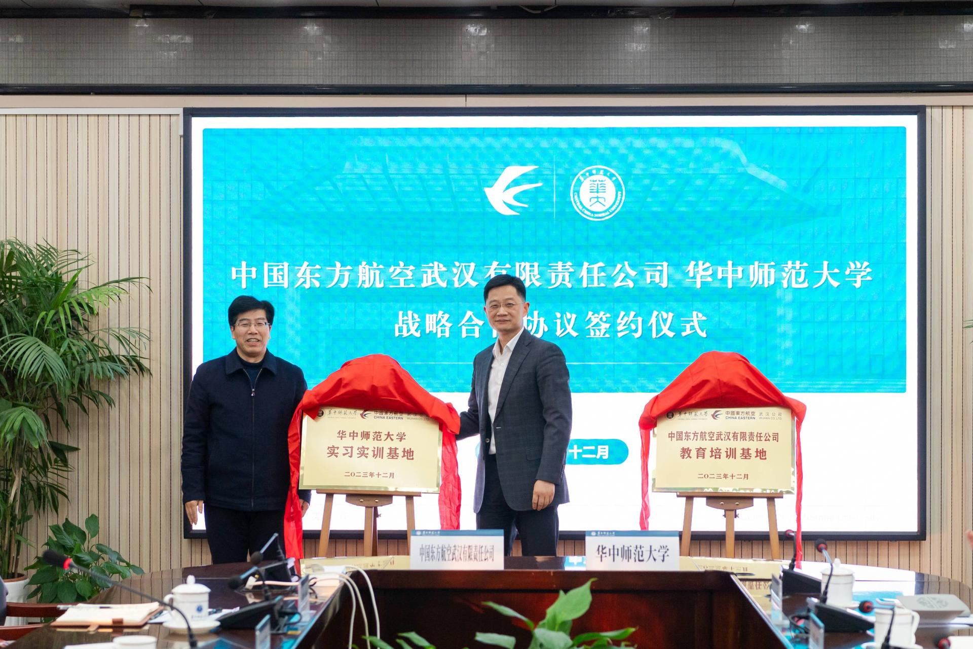 李良斌与彭双阶代表双方单位为中国东方航空武汉有限责任公司教育培训基地、安博站官网登录入口_安博(中国)实习实训基地揭牌。