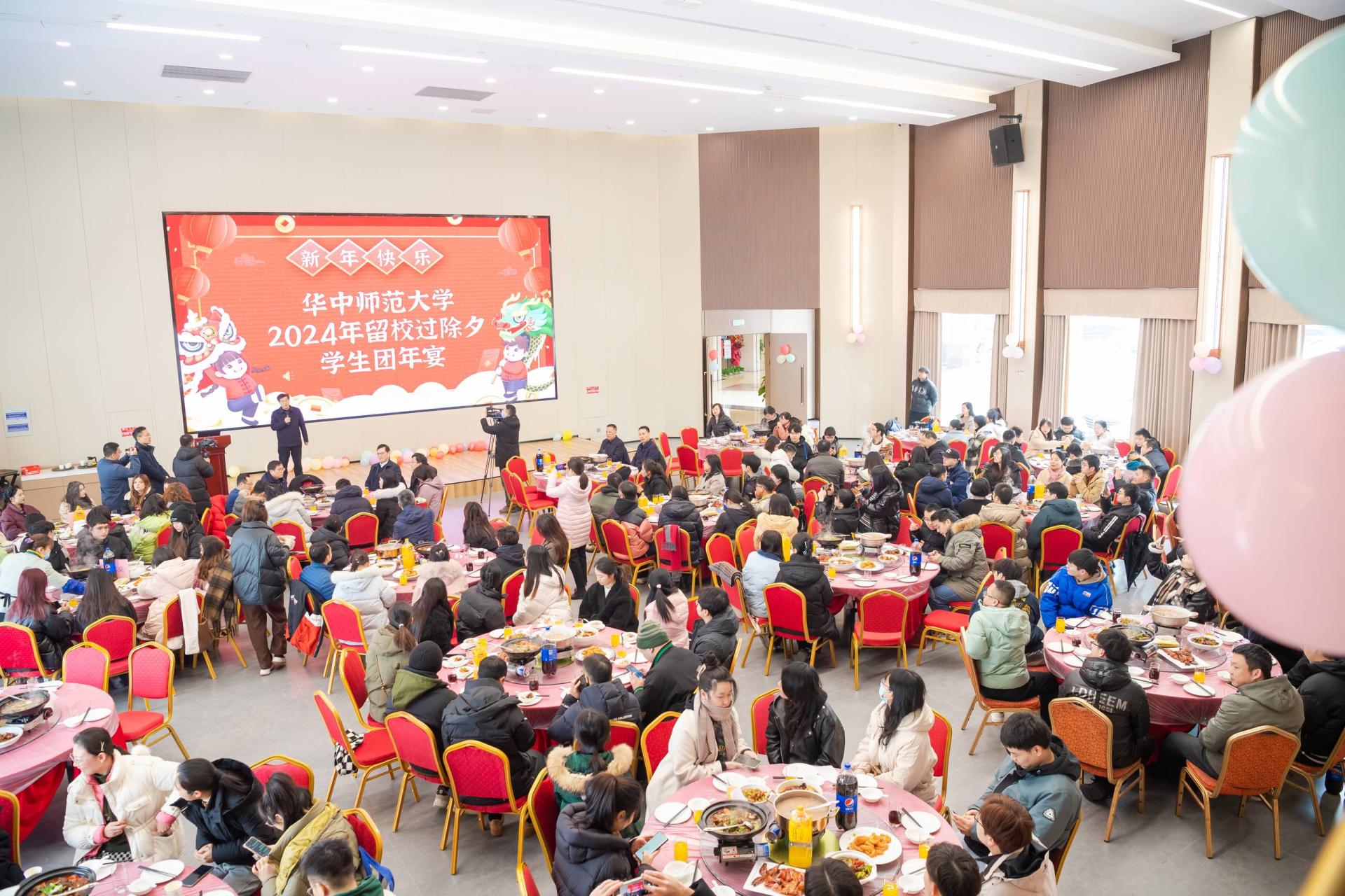 华大在线讯(记者 郝日虹)玉兔欢呈现旧岁,金龙献瑞迎新春。2月7日,2024年留校过春节学生团年宴在桂苑宾馆一楼中餐厅举行。校长彭双阶、副校长任友洲、校党委副书记陈迪明、各培养单位学生工作负责人及辅导员与120余名留校学生欢聚一堂,共迎新春佳节。