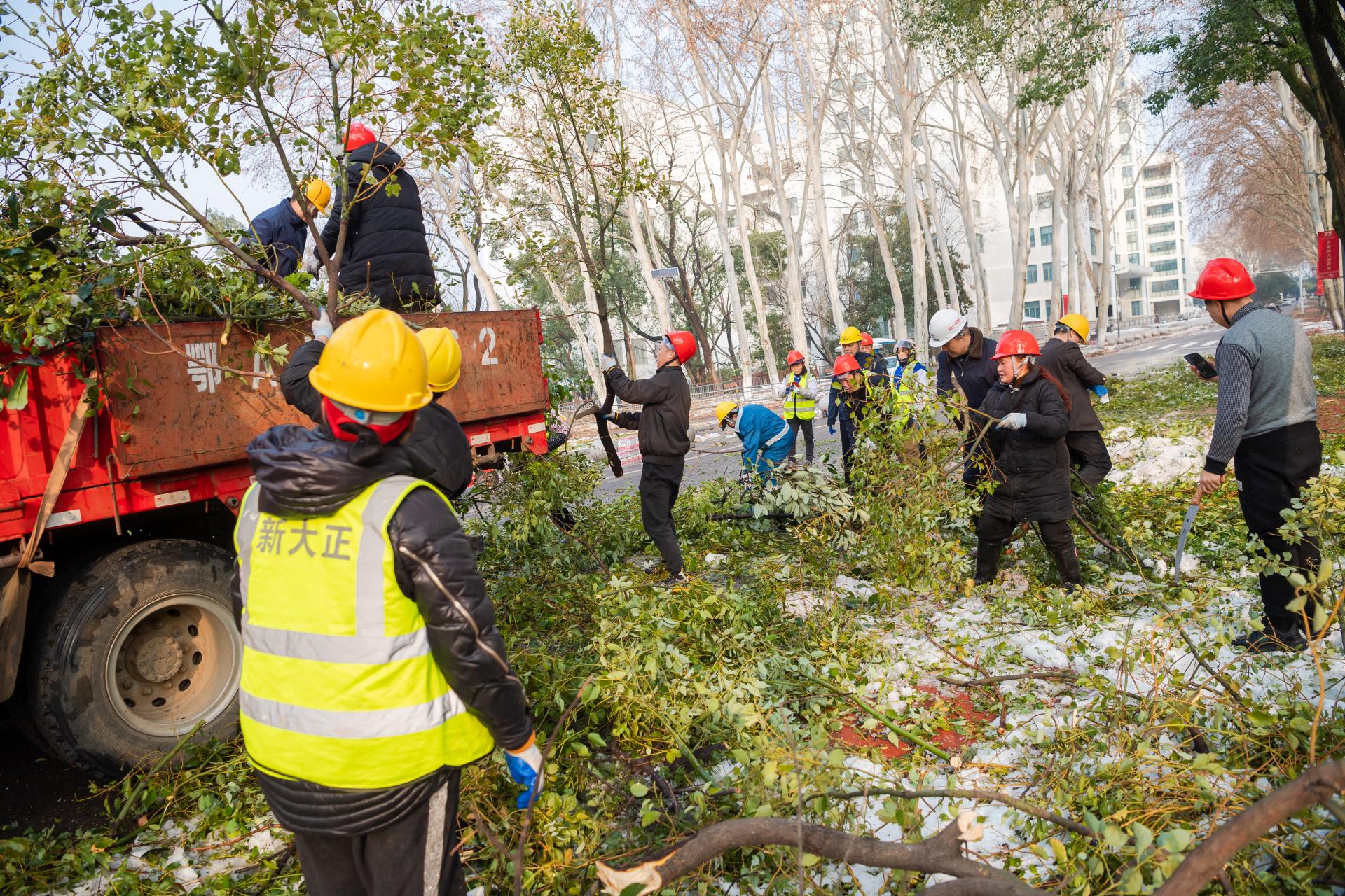 2月8日,学校召开紧急协调会,校党委书记夏立新、校长彭双阶要求学校办公室、后勤保障部、保卫处、物业公司协同联动,抢抓工期,分成清理、修复、美化三个阶段,采用自上而下、分段清理的方式,及时清理挂在树顶、楼顶、电线等高处的枯枝断枝,排除安全隐患;清扫校园道路上折断的树干树枝,全力保证道路畅通,恢复校园整洁。