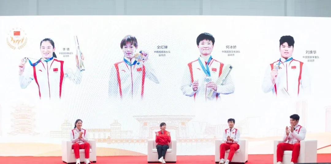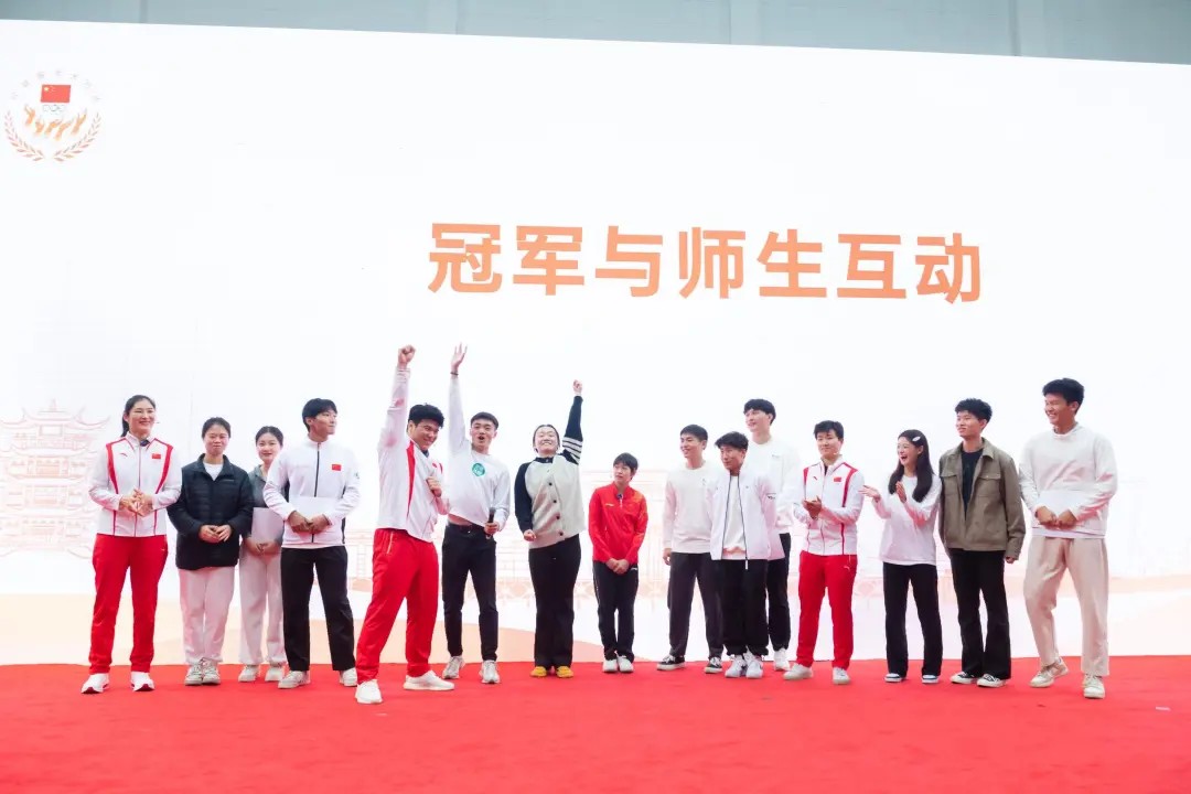 冠军访谈环节,四位奥运健儿向师生们分享了各自的成长故事,以及运动生涯中历经的荣耀和艰辛。三次征战奥运会,终于在巴黎奥运会上摘金圆梦,李倩说,希望将来的自己能成为教练员,为国家培养出更多的奥运冠军。从初登跳台“不敢往下看”到练就令人惊羡的“水花消失术”的奥运冠军,全红婵的秘诀是“不断练习,形成肌肉记忆。”质朴的语言和率真的分享赢得全场师生阵阵掌声。何冰娇坦言在自己的运动生涯中经历过大大小小的低谷期,“我相信只要坚持不放弃,就一定会走过去。跨过‘瓶颈’之后就会发现,技术水平就会迎来很大的提升。”刘焕华回顾了自己三年里跨越5个级别参赛的经历,尤其是备赛亚运会和奥运会期间,他直面体重挑战,毫不松懈地加紧训练,让观众看到了运动员在荣誉背后付出的汗水和努力。