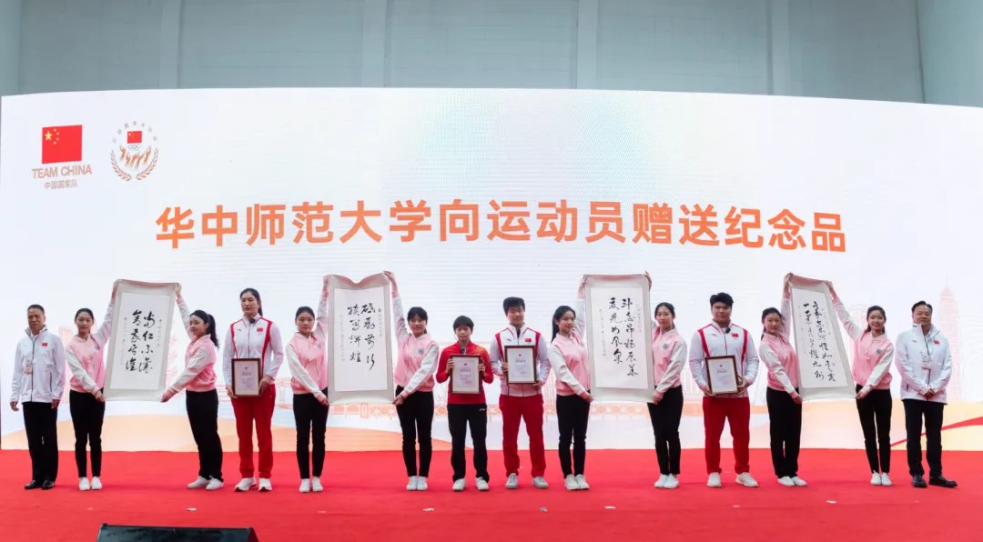 周鹏程等代表学校向奥运健儿赠送老教授汪长慰的书法作品