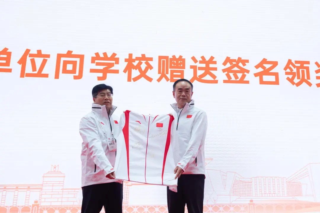 于建勇代表国家体育总局装备中心向学校赠送运动员签名的2024年巴黎奥运会中国体育代表团领奖服
