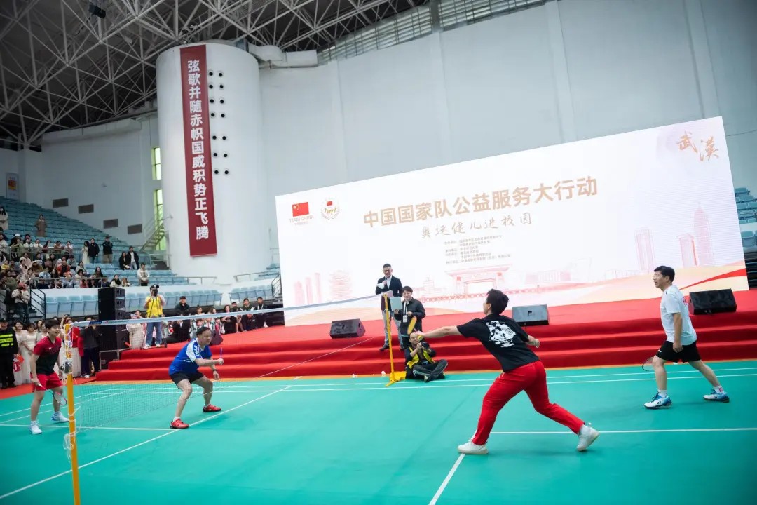 羽毛球表演赛中,对战双方你来我往,配合默契