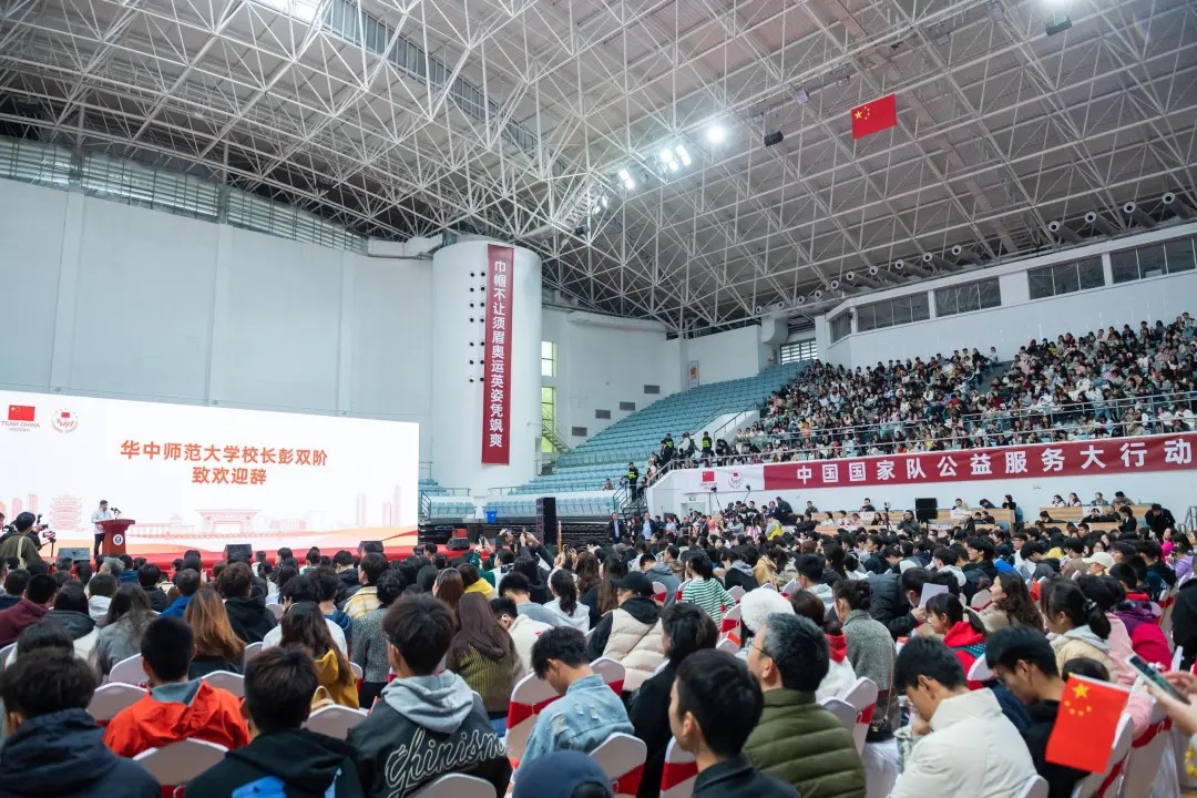 于建勇在讲话中谈到,自从2011年来,中国国家队公益服务大行动已累计在全国举办了上百场,邀请了数百位优秀运动员深入基层普及运动项目的知识,传递榜样的力量。每一位冠军运动员的荣耀背后都是无数次汗水与泪水的交织,是勇于挑战极限精神的生动诠释。希望通过本次活动,将奥运精神传递给每一位在座的同学,期待大家以奥运冠军为榜样,树立崇高理想,磨砺坚韧品质,勇敢追逐梦想。