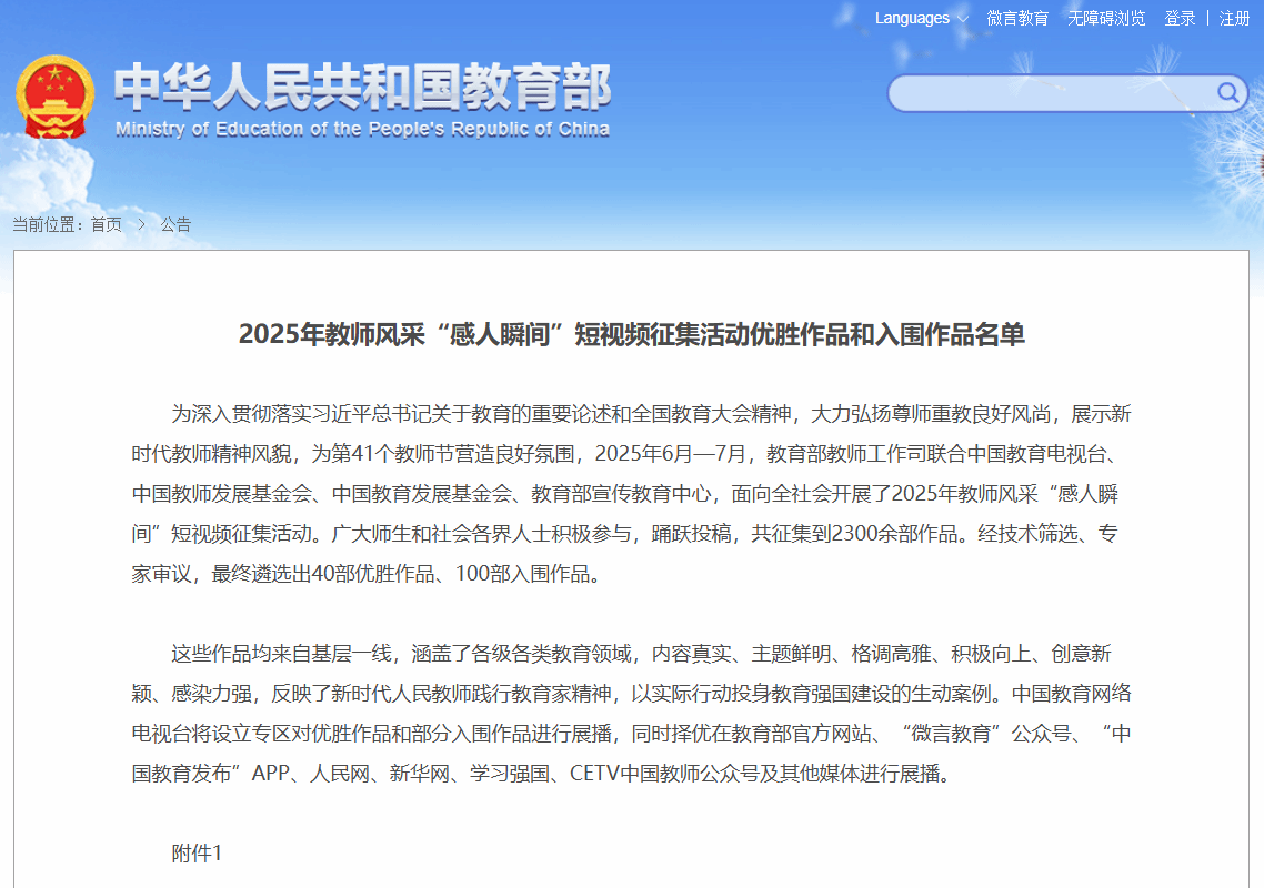 本次教师风采“感人瞬间”短视频征集活动由教育部教师工作司联合中国教育电视台、中国教师发展基金会等多部门共同举办,旨在为第41个教师节营造良好氛围,展现新时代教师队伍精神风貌。活动共征集到2300余部作品,经技术筛选与专家审议,最终遴选出40部优胜作品及100部入围作品。