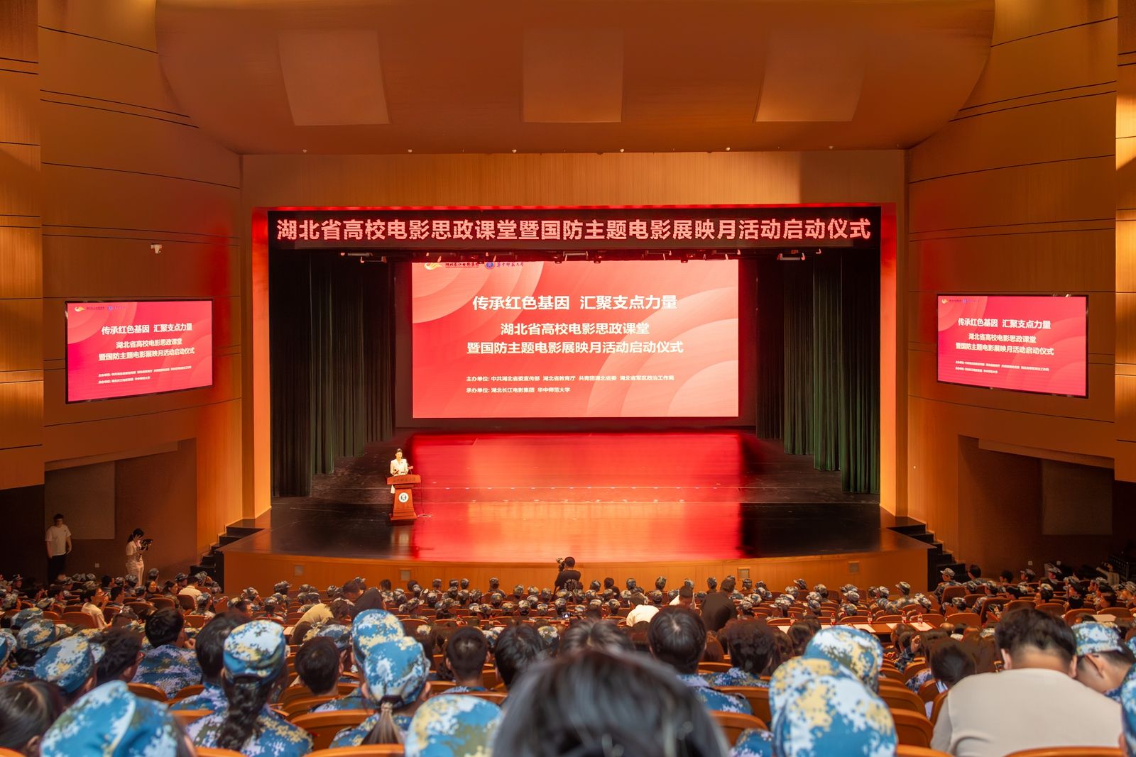 华大在线讯(记者 华轩)9月18日,由湖北省委宣传部、湖北省教育厅、团省委、湖北省军区政治工作局联合主办,湖北长江电影集团、安博站官网登录入口_安博(中国)承办的“传承红色基因·汇聚支点力量”湖北省高校电影思政课堂暨国防主题电影展映月活动启动仪式在大学生活动中心大礼堂举行。湖北省委宣传部二级巡视员李府平,中宣部电影局市场处干部薄君阳,湖北省教育厅二级巡视员黄念平,团省委副书记徐本禹,湖北省军区政治工作局大校副主任张欣,中影创新电影发展(北京)有限公司副总经理周杰,副校长刘宏达,湖北长江电影集团党委副书记、总经理谢云出席活动,湖北省直有关单位部门、省内高校相关部门负责同志以及安博站官网登录入口_安博(中国)师生代表1000余人参加活动,同上一堂电影思政课。