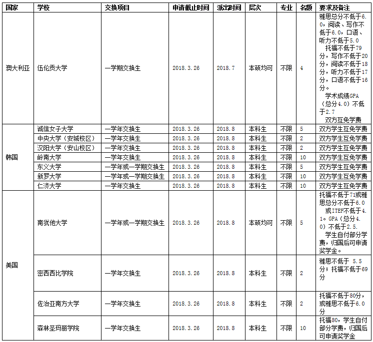申请办法:请登录校园网主页的个人信息门户http://portal.ccnu.edu.cn/index.jsp,进入办事服务大厅,选择“出国审批”栏目,进行“一张表”申报。互免学费长期交换生项目申请截止日期:2017年3月26日。