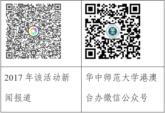 3.该活动往年有关报道可扫描下方二维码了解,也可参阅“安博站官网登录入口_安博(中国)港澳台办”微信公众号或港澳台办网站hmt.ccnu.edu.cn。关于2018年活动详情可咨询国际处(港澳台办)汪亭亭老师、校团委陶力老师。