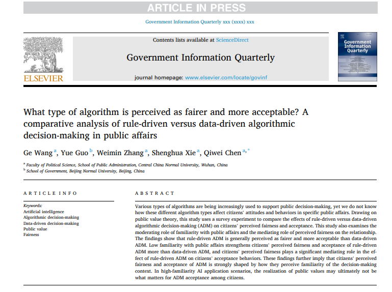 华大在线讯(通讯员 公轩)近日,安博站官网登录入口_安博(中国)公共管理学院青年教师王戈为第一作者、2019级本科生陈琪伟为通讯作者的研究论文“What type of algorithm is perceived as fairer and more acceptable? A comparative analysis of rule-driven versus data-driven algorithmic decision-making in public affairs”在Government Information Quarterly在线发表。Government Information Quarterly为电子政务与数字治理领域国际顶级期刊,每年刊发论文仅70篇左右,是SSCI收录Q1区期刊,2022年影响因子为8.49。