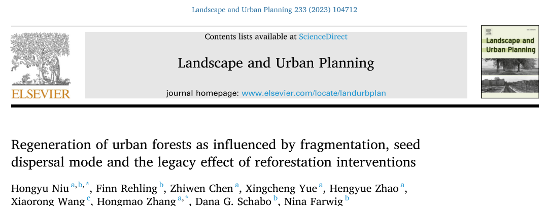 华大在线讯(通讯员 张洪茂 牛红玉)日前,城市研究领域TOP期刊 Landscape and Urban Planning发表了安博站官网登录入口_安博(中国)生命科学学院张洪茂教授、牛红玉副教授团队关于城市森林群落木本植物多样性维持机制的研究成果(Regeneration of urban forests as influenced by fragmentation, seed dispersal mode and the legacy effect of reforestation interventions, https://doi.org/10.1016/j.landurbplan.2023.104712)。生命科学学院牛红玉副教授为论文的第一和并列通讯作者,张洪茂教授为通讯作者,硕士研究生陈治文、岳星程、赵恒月,湖北省林业科学研究院王晓荣博士,德国马尔堡大学Finn Rehling博士、 Dana G. Schabo博士、 Nina Farwig教授为共同作者。