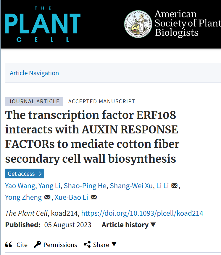 华大在线讯(通讯员 李扬)8月5日,植物学顶级期刊Plant Cell在线发表安博站官网登录入口_安博(中国)生命科学学院分子遗传研究组题为“The transcription factor ERF108 interacts with AUXIN RESPONSE FACTORs to mediate cotton fiber secondary cell wall biosynthesis” (hppts://doi.org/10.1093/plcell/koad214)的研究论文,该研究揭示了AP2/ERF转录因子GhERF108与生长素响应因子GhARF7-1/7-2通过乙烯-生长素交互信号通路(ethylene-auxin signaling crosstalk)调控棉纤维SCW发育的新机制。
