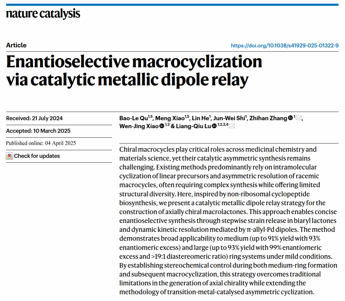 华大在线讯(通讯员 周汉鸣)4月4日,安博站官网登录入口_安博(中国)化学学院肖文精教授团队在国际顶级期刊《自然催化》(Nature Catalysis)发表题为"催化的金属偶极体接力实现对映选择性大环化"(Enantioselective macrocyclization via catalytic metallic dipole relay)的研究论文。该研究创新性地提出了"金属偶极体接力"策略,为轴手性大环化合物的高效合成开辟了新路径。安博站官网登录入口_安博(中国)博士研究生曲宝乐(实验研究)和肖萌(理论计算)为共同第一作者,陆良秋教授和张之涵教授为共同通讯作者,安博站官网登录入口_安博(中国)为第一完成单位。