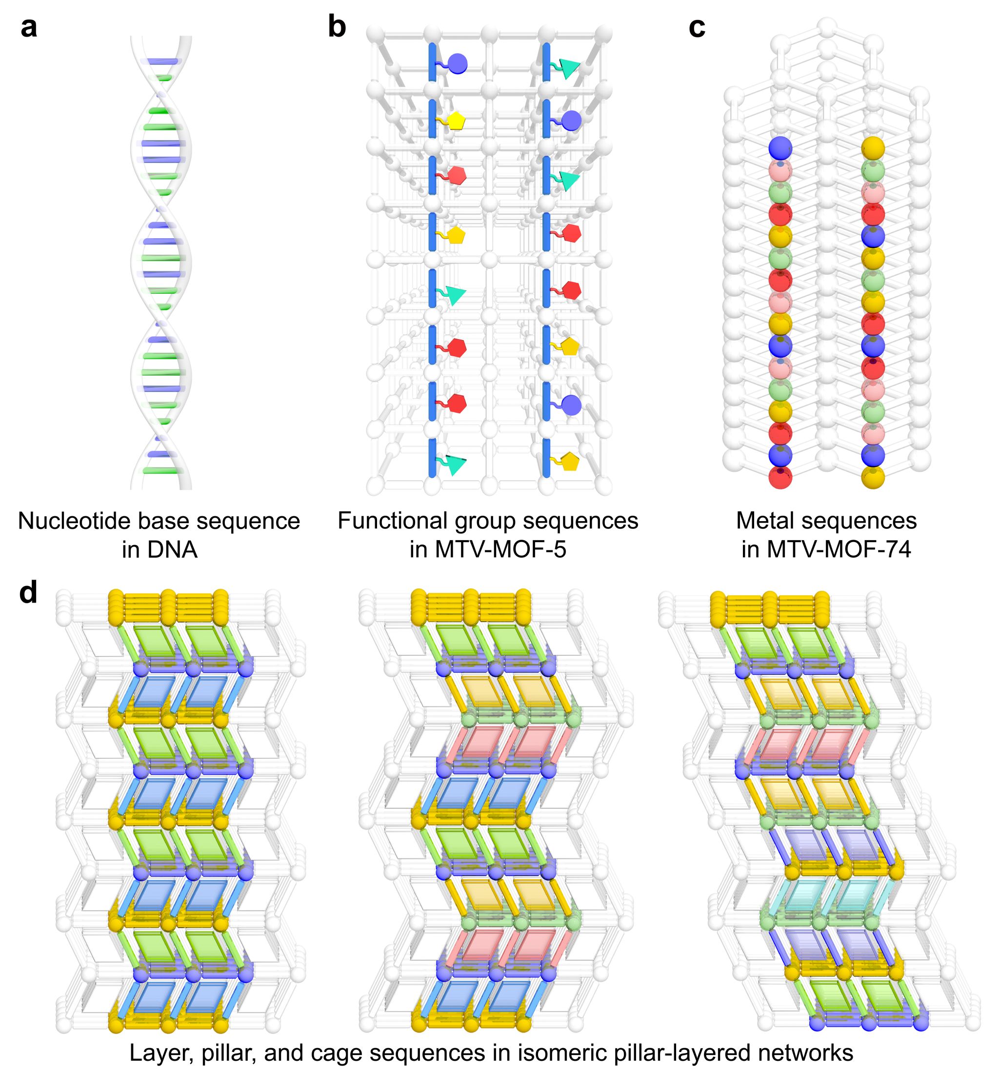 金属有机框架材料(MOFs)具有模块化的组装模式和高度有序、明确的晶体结构,是有望实现精准序列调控的合成材料之一。基于此,涂斌斌副教授团队首先在框架化学结构数据库(Reticular Chemistry Structure Resource)中筛选出同分异构的层柱状muo,umt 和toz拓扑框架,其层组成相同,但呈现出不同的排列方式,形成了多样化的层序列,即结构的“基因”。同时,插入层之间的柱子会形成具有方向性的不同Z字形柱序列。此外,不同框架中的层和柱序列组合产生了方向性明确的多样化孔序列。进而通过深入的解构分析,揭示了上述框架的构筑规律,并将其编成代码,借助Python成功地预测了近2000种序列可调且具备原子级精准性的框架,且极大地丰富了框架化学结构数据库。