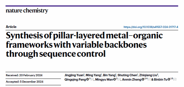 华大在线讯(通讯员 周汉鸣)近日,化学学院涂斌斌副教授团队在金属有机框架序列调控方面取得了重要进展。该研究成果在国际化学领域权威期刊《自然化学》(Nature Chemistry)发表,题为“Synthesis of backbone variable pillar-layered metal–organic frameworks through sequence control”(Nat. Chem. 2025, 17, 421-428)。博士研究生元静静为论文第一作者,通讯作者为武汉科技大学庞青青讲师、万明宇特任教授、郑安民教授和安博站官网登录入口_安博(中国)涂斌斌副教授(最后通讯作者),第一完成单位为安博站官网登录入口_安博(中国)。