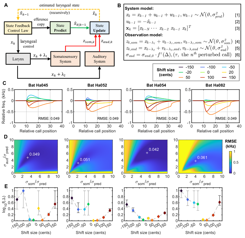目前关于回声定位蝙蝠发声频率调节的假说主要包括多普勒频移补偿(Doppler shift compensation)、干扰规避反应(Jamming avoidance response)和注意反应假说(Attention reaction hypothesis),但是这些现有的假说均不能完整地解释本实验的结果。随后,研究人员将思路投向了人类言语的频率调节假说——感觉误差校准假说(Sensory error correction)。人类言语的频率调节机制研究相对透彻,已经建立了高质量的数据计算模型。课题组经过不懈努力,成功将人类言语频率调节的状态反馈控制(Statefeedbackcontrol)模型应用到了大蹄蝠回声定位声波频率调节上。在大蹄蝠上构建的状态反馈控制模型不仅具有极高的精度(总体误差仅为61Hz,约为大蹄蝠自然发声频率变异的四分之一),而且能解释为什么同一只蝙蝠在不同听觉反馈干扰条件下呈现出不同的发声频率调节行为,也能够解释同一条件下不同个体之间的显著行为差异。
