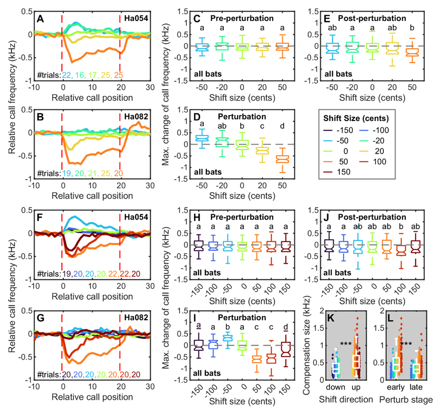 该研究进一步发现,干扰频率(感觉误差)的大小影响大蹄蝠频率补偿的大小,但是两者并不是简单的线性关系。其中在正向50音分的频移下,大蹄蝠的频率补偿行为最为明显。这可能是因为正向50音分对应的飞行速度与大蹄蝠在自然状态下的飞行速度最接近,蝙蝠对此实验条件感觉更真实。